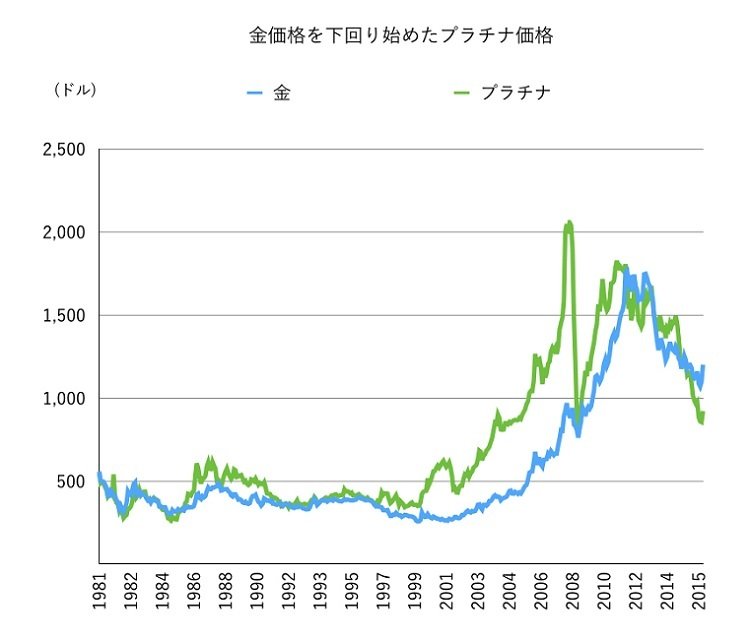 プラチナ価格はリーマンショック前に史上最高値を記録しましたが、その後は低迷が続いています。昨今は金価格よりも安いという“逆転現象”が定着しつつあります。