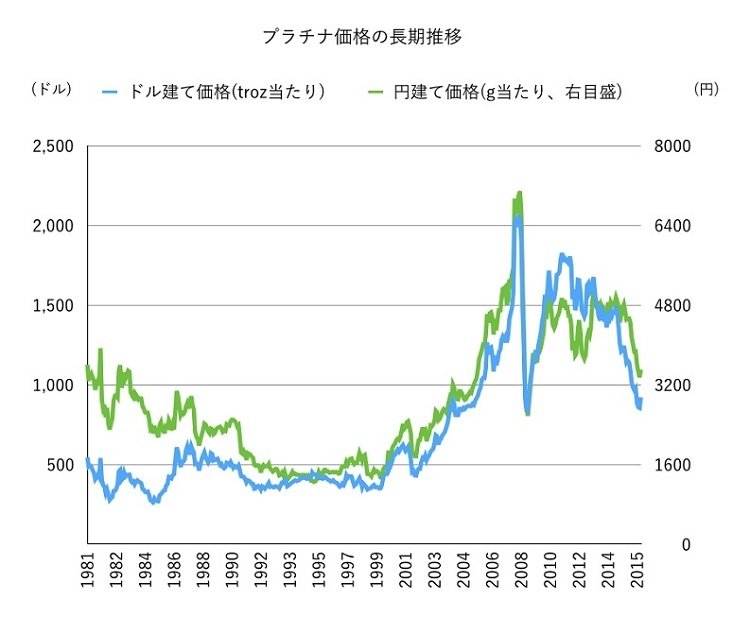さて、プラチナ価格の推移を見てみましょう。1981年~2002年までの20年間以上にわたり、プラチナは概ね350~550ドル(1トロイオンス当たり、以下同)で推移していました。それが2003年から急騰し始め、2008年3月には2,273ドルの最高値を記録したのです。