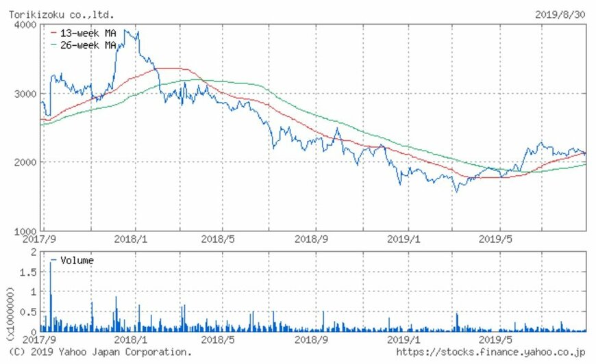 鳥貴族の2019年7月期Q3(累計)決算短信によると、売上高は対前年同期比で+7.3%増、営業利益は同▲46%減であり、増収を維持する一方で、大幅な減益となりました。
