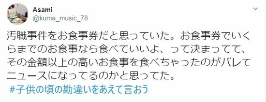 「汚職事件をお食事券だと思っていた。お食事券でいくらまでのお食事なら食べていいよ、って決まってて、その金額以上の高いお食事を食べちゃったのがバレてニュースになってるのかと思ってた。」
