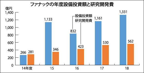 この営業利益率の低下の一因として、近年積極的に行ってきたファナックの設備投資がある。グラフが示すようにファナックでは、15年度以降、1000億円規模の設備投資が実施されており、直近の18年度においては1331億円の設備投資を実施した。