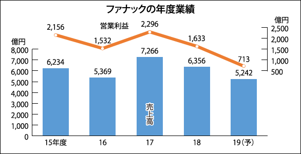FA大手のファナックは高収益企業として知られるが、足元の業績は一時の収益力が影を潜めている。米中貿易摩擦に伴う需要の減少に加え、ここ数年の積極投資が影響している -