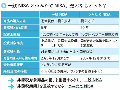 このNISAには、2014年から始まった従来型の「一般NISA」と、2018年から新たに始まった「つみたてNISA」の2種類があります。この2つの大きな違いは、「非課税となる期間」「年間上限額」そして「対象商品」の3点です。