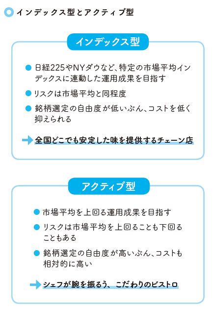 レストランでたとえるなら、インデックス型の投資信託は、どの店舗でも同じ価格で均一の味を提供するチェーン店。対してアクティブ型は、シェフが腕を振るうこだわりのビストロといったところでしょうか。
