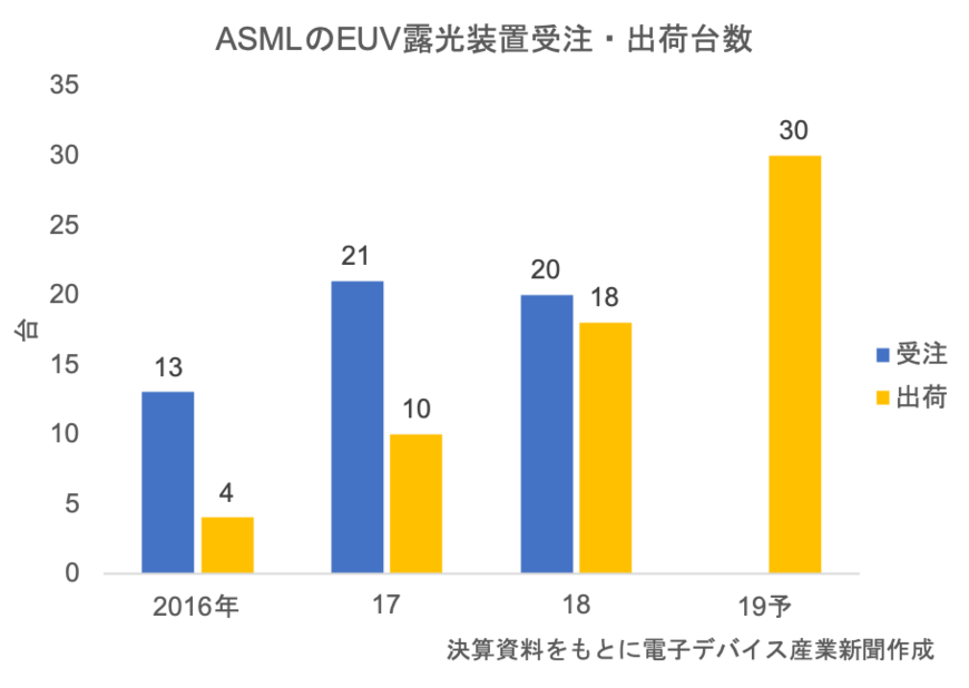 これら顧客にEUV露光装置を供給するASMLの足元の受注・出荷状況も好調だ。19年は通年ベースで計30台の出荷を見込んでいるほか、直近の4~6月期には10台の大量受注を獲得した。EUVはまず先端ロジックを当面のアプリケーションとするものの、将来的にはDRAMも有力候補と位置づけられており、関連する材料・装置業界からの期待も高まっている。