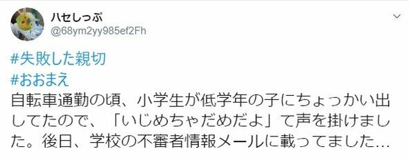 「自転車通勤の頃、小学生が低学年の子にちょっかい出してたので、「いじめちゃだめだよ」て声を掛けました。後日、学校の不審者情報メールに載ってました…」
