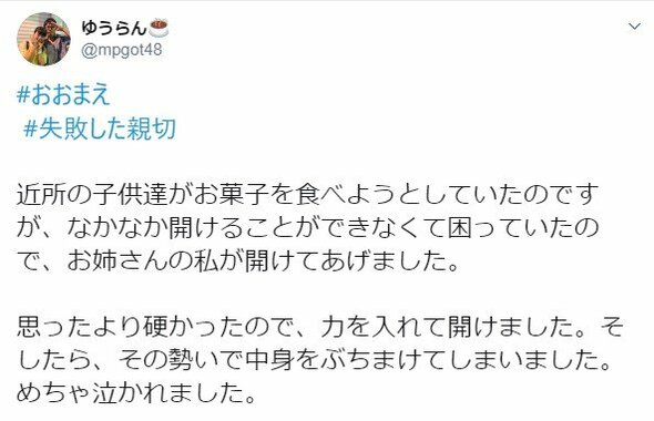 「#失敗した親切」のタグに集まったツイートのように、親切はときどき失敗してしまいます。恥ずかしかったり、嫌な思いをしてしまうこともありますが、その後も怖れずに親切を続けていきたいものです。もしも失敗の親切を受けたらそれを咎めることなく、次も親切にしてねとお願いしたいですね。