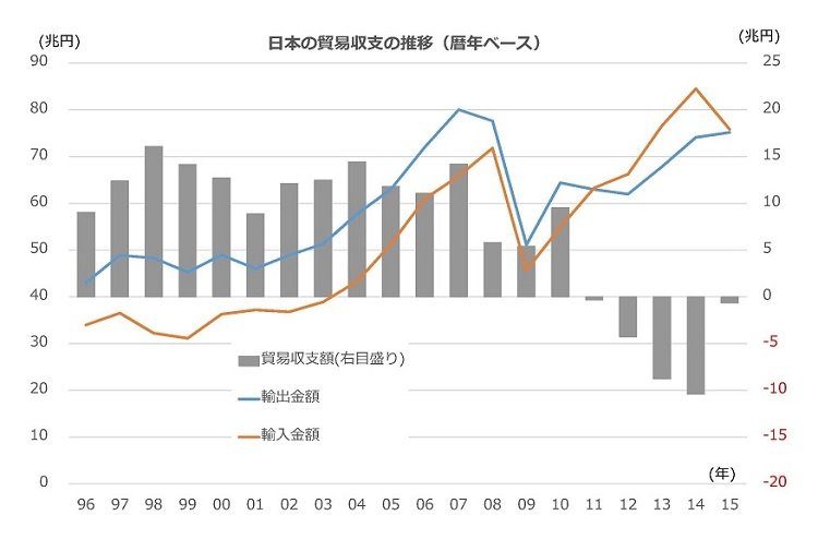 最大の要因は、原発の稼働停止等に伴うエネルギー輸入額の激増です。昨今の原油価格下落で赤字幅は縮小しましたが、中国向け輸出の停滞などで厳しい状況にあります。