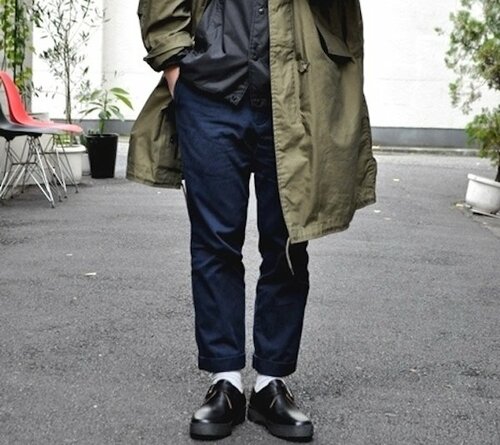 さらに生地は高密度なベンタイルコットンという、なんとも珍しいチョイス。かすかに光沢感を放つ生地ゆえ、どこか上品な雰囲気になるのもポイントです。写真ではオールスターを合わせていますが、かっちりしたレザーのプレーントゥでも様になるかと。