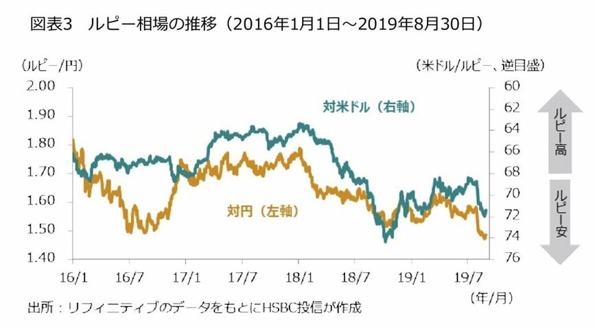 インドルピーは8月以降、下落している(8月30日現在)。新興国市場全般に対する投資家センチメントの悪化、国内ではインド政府がカシミール州の自治権を剥奪し、パキスタンとの緊張が高まっていることが悪材料となっている。