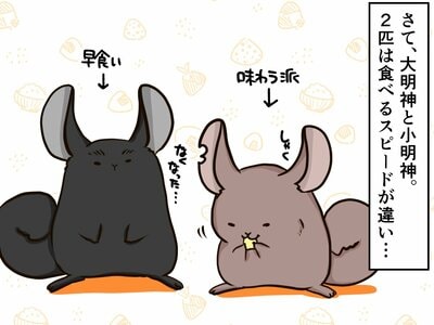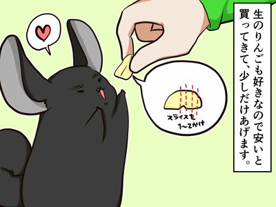 レーズンとりんごが大好きなチンチラさんたち。ふだんはドライフルーツをおやつに食べていますが、時には、飼い主である祭さんと一緒に生のりんごを楽しむことも…。