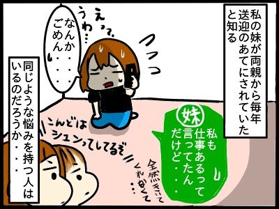 なんと、両親の仕事の予定と重なってしまい「運動会には来れない」というのです。両親には悪いけれど、とにかくホッ。しかし、この事態に安堵した人が、実はもう一人いたのです。それは、ねこねこむさんの妹さん。行事のたびに、学校まで両親を送迎するよう頼まれていたそうで、妹さん曰く「毎年、仕事があるといって断るんだけどね、両親が聞いてくれなくて…。」