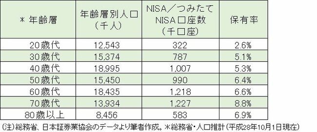 年齢別の当該口座保有比率を見るともう少しばらつきがあり、20代では2.6%、30代で5.1%、40代・50代ではそれぞれ5.3%、6.4%程度と、口座開設率は各年齢層人口の10分の1以下となっています(図表1)。筆者の感覚では、それでもかなり増えたなという感じです。