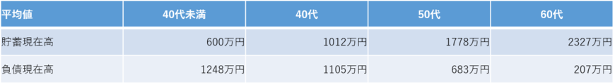 40代では貯蓄現在高と負債現在高が拮抗している状況です。40代未満や40代は住宅ローンや子どもの学費などが家計の大きな負担になりやすい時期といえるでしょう。50代では貯蓄現在高が負債現在高を大きく上回り、60代では貯蓄現在高が2000万円を突破しています。