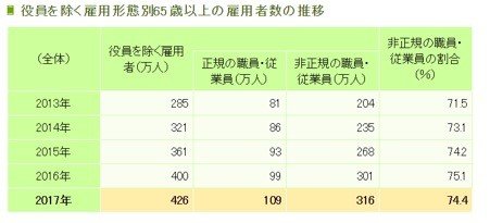 厚生労働省の「労働力調査年報」によると、65歳以上の雇用者は年々増え続けており、2013年で285万人だったものが徐々に増え続け、2017年では426万人と、たった4年で141万人も増加しています。(表「役員を除く雇用形態別65歳以上の雇用者数の推移」を参照)