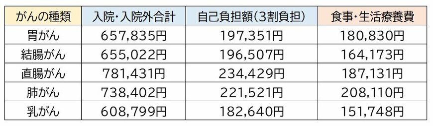 がんと診断された場合、治療費としてどのくらいかかるのでしょうか。下の図表1は、代表的ながんの種類別治療費及び食事・生活療養費です。