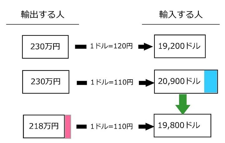 もし、輸入する人が「値上げは認めない。19,200ドルのままだ」と譲らなかった場合、輸出する人は約211万円に値下げしなければなりません(=19,200×110円/ドル)。受取金額は▲19万円減ってしまうのです。