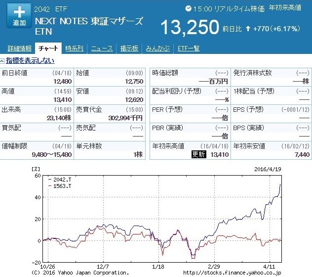 個別銘柄はよく分からないが、値動きがよさそうなのでマザーズと名が付いたETNやETFに関心がある、という個人投資家もいらっしゃるかもしれません。ちなみに、現時点では、そうしたETN、ETFは、NEXT NOTES 東証マザーズ ETN(2042)とマザーズ・コア上場投信(1563)の2銘柄が上場しています。