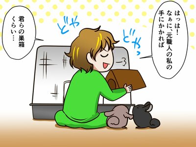 とうとう試作品をケージに入れることをあきらめた祭さんは、元金型職人のプライドはどこへやら、チンチラさんたちに宣言します。「よし!巣箱買おっか!」。そうして数日後、チンチラさんたちのケージには、既製品の巣箱が設置されることとなったのでした。第22話もお楽しみに。