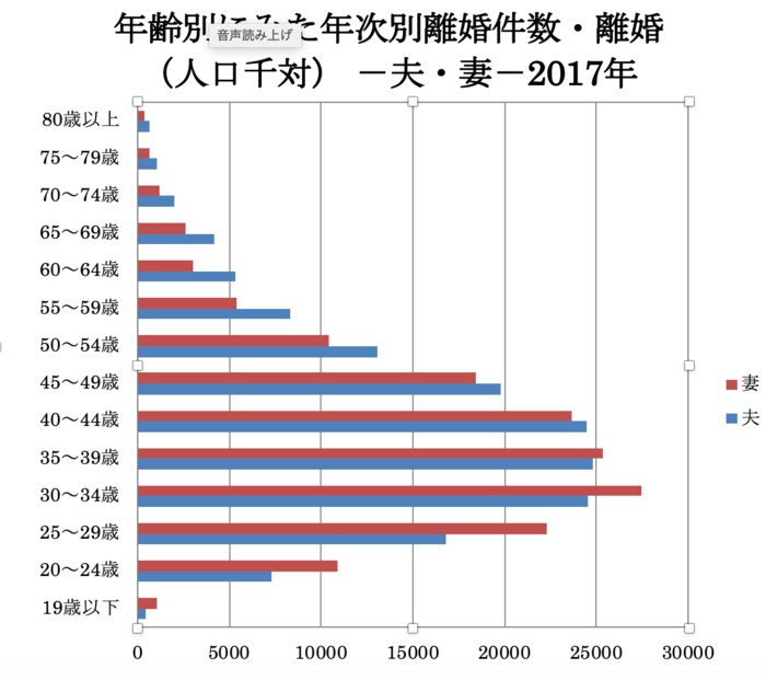 政府統計「e-Stat」「同居をやめたときの年齢別にみた年次別離婚件数・離婚率(人口千対) -夫・妻-(2017年)」