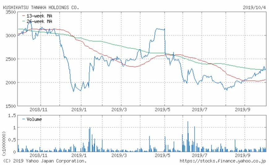 同社株価は、2017年11月末7,000円台の高値を天井に下落を開始しました。2019年は1月と8月に1,700円台でダブルボトムのチャートを形成しています。8月6日の安値1,772円からの反発局面が続いており、現在は2,300円付近での取引がなされています。