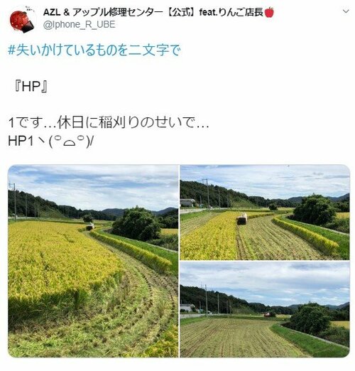 休日の稲刈りでHP(ヒットポイント=体力)の値が1になってしまったりんご店長さん、おつかれさまでした。刈られた稲はおいしい新米となって、誰かの食卓できっとよろこばれるでしょう。