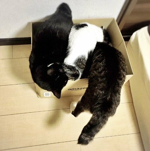 猫のみなさんは「ぎゅうぎゅう」が好きです。この画像でも、黒白猫さんと黒ぶち猫さんが入って既にいっぱいのダンボール箱に、さらにキジトラ猫さんが入り込もうとしています。入ってしまったらもう隙間などありません。みっちりです。