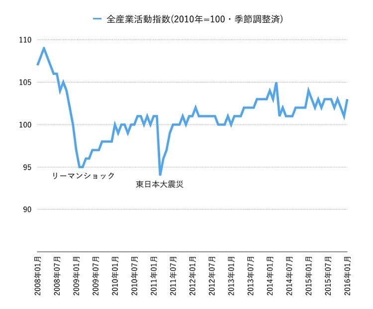 過去の全産業活動指数を振り返ると、リーマンショック、東日本大震災など、大規模な金融危機や災害時には、明確な落ち込みを記録してきました。今回の全産業活動指数は2月分なので熊本地震の影響は反映されませんが、今後、チェックしていくようにしましょう。