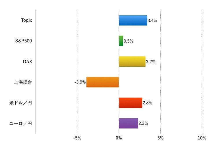 先週(4月18日-4月22日)の株式市場は、まちまちの動きになりました。TopixとDAXがそれぞれ+3.4%、+3.2%上昇する一方、上海総合は▲3.9%下落しました。S&P500は+0.5%上昇しましたが、NASDAQ総合は▲0.6%と下落しています。先々週から見られている年初来出遅れた株式市場が上昇する傾向が、先週も日欧株で続いています。