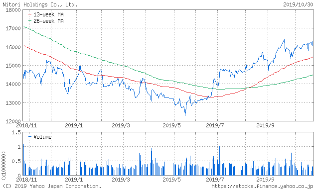 過去1年は、今年春には13000円を割れるなどしましたが、現在は16000円前後の株価水準となっています(2019年10月現在)。