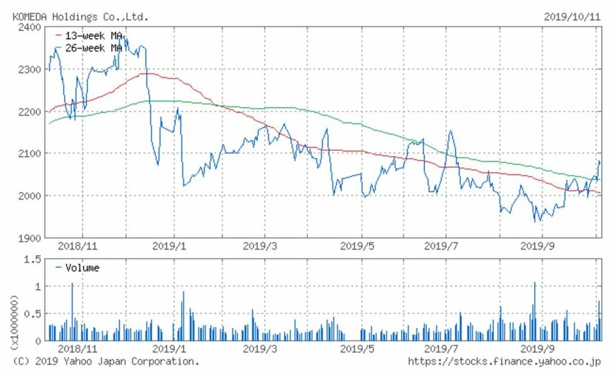 同社の株価は、2018年10月に高値2,400円を付けた後に反落しました。2019年に入り概ね2,000円~2,150円間のレンジ相場が続きましたが、8月に入り2,000円を割れた後は、年初来安値の1,950~2,000円付近での取引が続きました。しかし10月に入り再び2,000円台を回復しています。