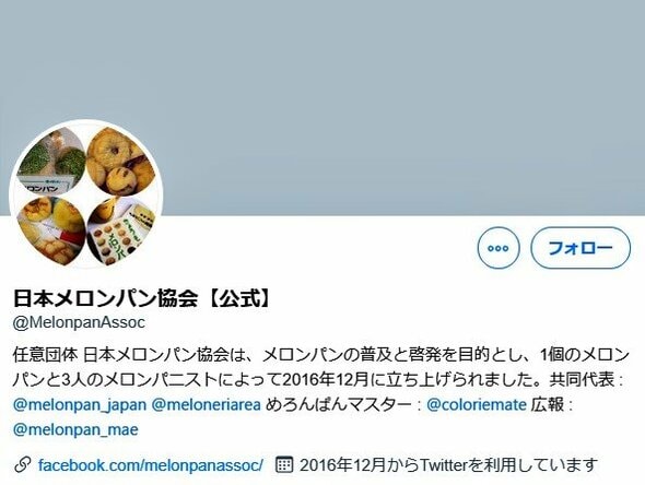 実は日本メロンパン協会にもTwitter公式アカウント(@MelonpanAssoc)が存在します。そのプロフィールによると日本メロンパン協会は「任意団体で、メロンパンの普及と啓発を目的とし、1個のメロンパンと3人のメロンパニストによって2016年に立ち上げられた」とのことです。
