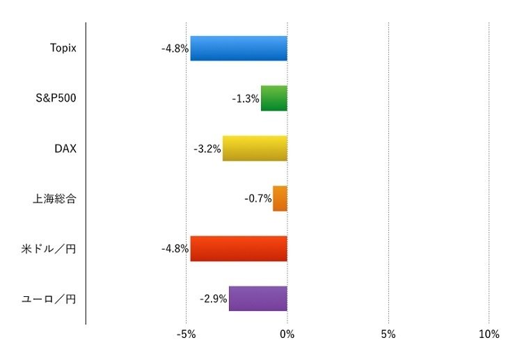 先週(4月25日‐4月29日)の株式市場はロシア、ブラジル市場など一部の市場を除き下落しました。特に日本株と欧州株は、先々週の上昇の反動もあり急落しています。