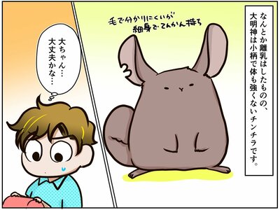 2012年の春頃のこと。母親に育児放棄をされた大明神さんは、元の飼い主に半ば押し付けられるように、祭さんのもとにやってきました。当時はデグーしか飼ったことがなく、いきなりやってきた乳離れをしていないチンチラに四苦八苦。試行錯誤の末に離乳はさせましたが、大明神さんは、小柄であまり身体の強くないチンチラに育ってしまいました…。