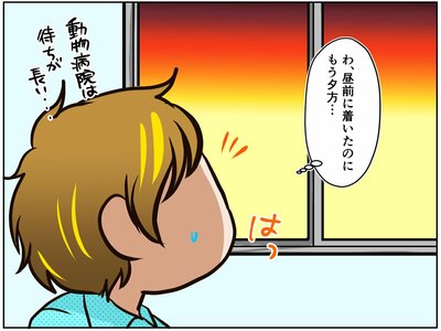「大ちゃん、大丈夫かな…。」ふと窓の外を見ると、昼前に病院についたはずが、もう夕方になっています。「全身麻酔をかけての検査をお願いするという判断は、正しかったんだろうか…?」。日が陰るにしたがって、祭さんの心の中にも迷いが影を落とします。「もし、大明神が目を覚まさなかったら…?」