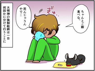 大明神さんとともに家に戻った祭さんは、お医者さんの「柔らかいものを食べさせて、まずは体重を元に戻しましょう。」という言葉に従って、強制給餌を開始します。