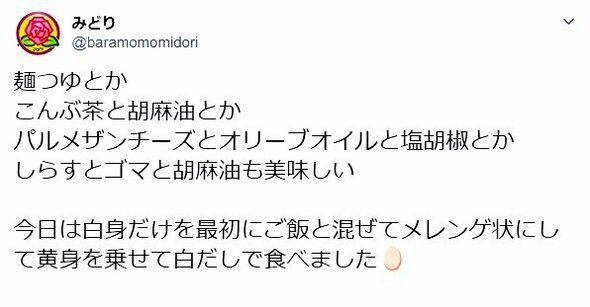「たまごかけごはんの日」には独自の工夫を凝らしたオリジナルのたまごかけごはんをツイートする人もたくさんいました。本稿ではその中からいくつかピックアップしてご紹介します。