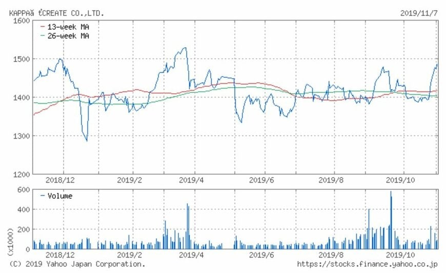 同社の株価は2018年半ばから、上限1,500円付近と下限1,300円付近の間でレンジ相場を形成しています。9月半ばに一時1,500円にタッチしましたが、その後すぐに株価は下落しました。11月に入り再び1,500円に向けた上昇を開始しており、1,500円付近のサポート&レジスタンスを上に抜ける動きにまで至るのか注目されます。