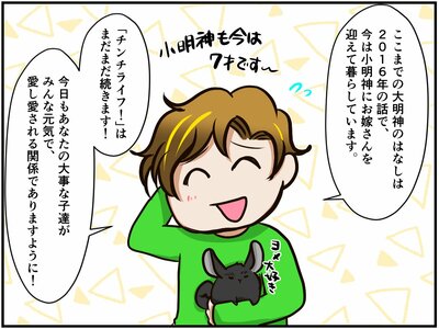 そして当時は、元気いっぱいのいたずらっ子だった小明神さんも、今では7歳になり、お嫁さんを迎えているといいます。ヨメ大好きなのに、なぜかダメ夫な小明神さんの夫婦エピソードも近日公開される予定とのこと!まだまだ続くチンチライフ、次回もどうぞお楽しみに。