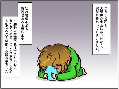 1時間後。だんだんと意識がはっきりしてきた様子の大明神さん。苦しそうに息をしながら、手を差し出してきました。「ん?どうした?手?」といいながら、大明神さんの手を取る祭さん。小さな、小さな手。いつも祭さんからおやつを大事そうに受け取っていた手。握手会ごっこでいつもつないでいた手。「ここにおるよ。」と言いながら、祭さんがその小さな手をきゅっと握ってあげると、「ピィ」と大明神さんが声を上げました。