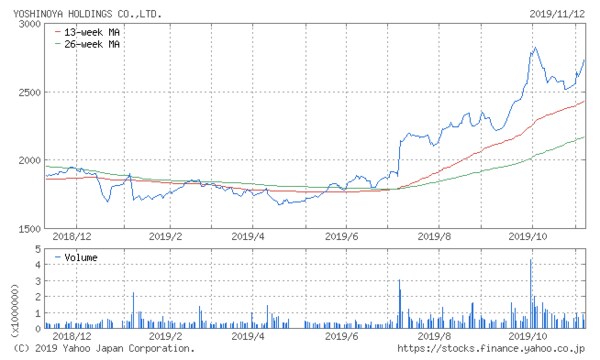 シリーズでお伝えしている「注目小売店月次実績」。今回は牛丼チェーン店「吉野家」他を運営する吉野家HD(9861)の、2019年10月の月次動向及び過去実績、また過去1年の株価動向について振り返ってみましょう。