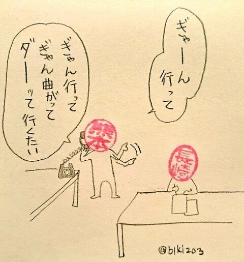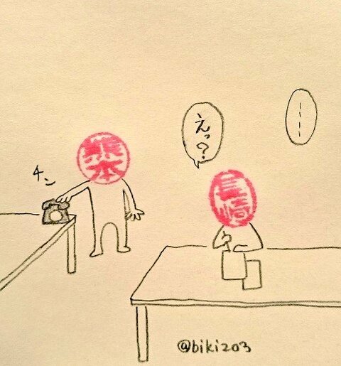 顔の部分がハンコだといつも同じ顔で表情の変化がありませんが、ハンコを押す角度を変えたりちょっとした動きをつけたりして、喜怒哀楽を表現するようにしているとのことです。その方が実際に表情を描くよりも豊かな表現ができるという発見があった、とビキさんは仰っています。
