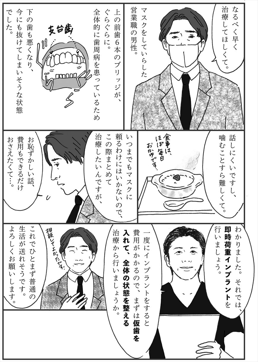 このマンガ〈図版参照〉の男性は、過去に治療した歯の具合が悪くなり、いまにも歯が抜けそうな状況になっています。彼のように、国民病ともいえる歯周病を放っておいたら大変なことになってしまった、という患者さんは非常に多くいます。歯周病は早くて30代・40代には自覚症状が出てきます。