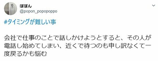 「会社で仕事のことで話しかけようとすると、その人が電話し始めてしまい、近くで待つのも申し訳なくて一度戻るかも悩む」
