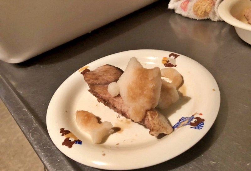 魚の切身に両手をかける猫の前には、大根おろしの魚が。顔を作らなくてもかわいい造形の猫という生きものはずるいとさえ言えます。