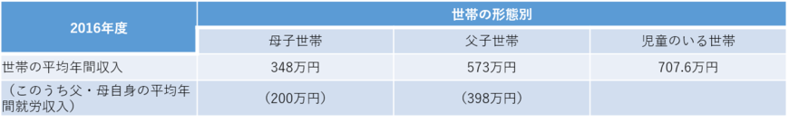 厚生労働省の「平成28年国民生活基礎調査の概況」によると「児童のいる世帯」の平均年間収入は700万円を超えています。一方、母子世帯の平均年間収入はその半分程度、父子世帯は8割程度にとどまっている状況です。