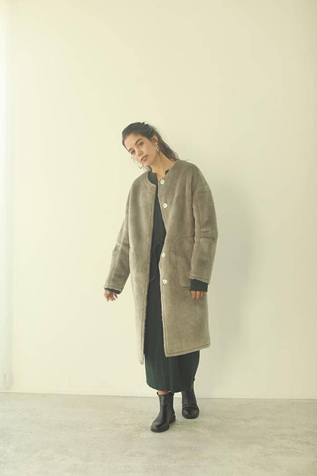 まるでブランケットにくるまっているかのような暖かさのエコムートン素材のロングコート。