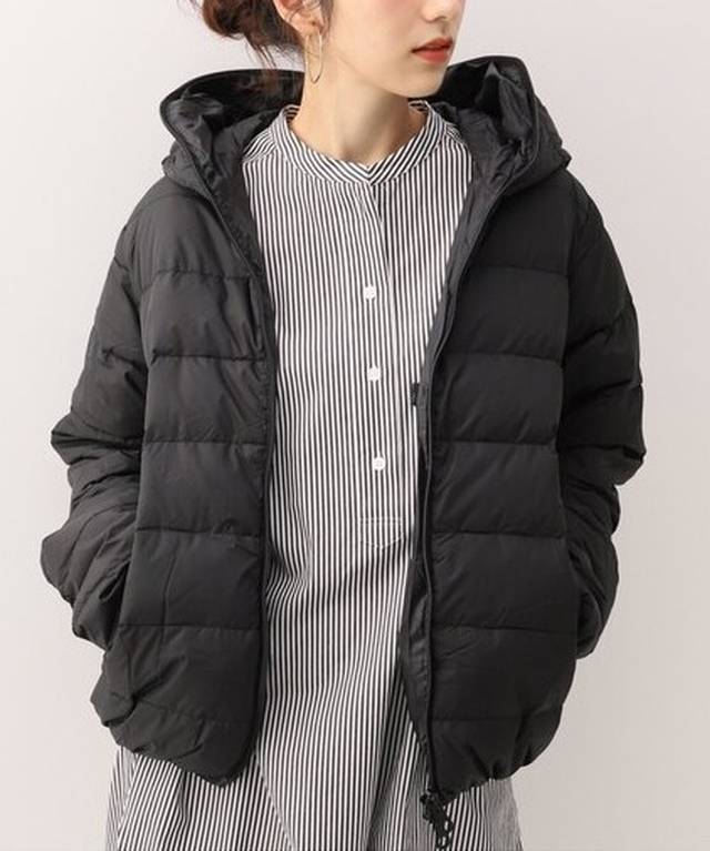 メンズライクな黒のダウンジャケットは、ショート丈が使いやすい!ワンピースに羽織ったり、デニムパンツと合わせても、サマになります。