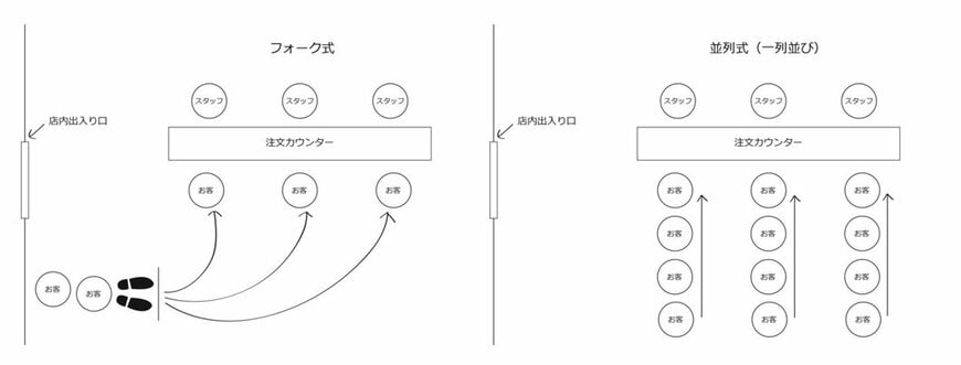 - A子が行ったことのある、同じファーストフード店の系列店では並列式(一列式)の並び方しか経験したことがなかった