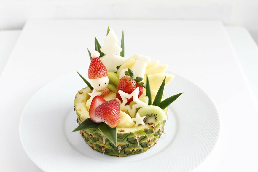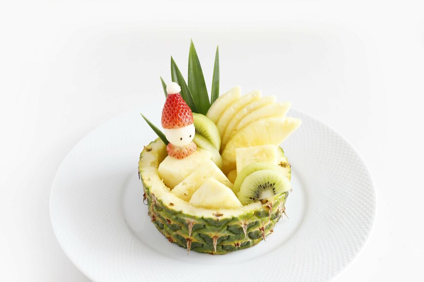 3 パイナップルのスライスを扇状に広げて2の葉の手前に差し込み、1を一口大のパイナップルに刺し、キウイをのせる。残りの葉をバランスよく差し込む。(写真「3 サンタクロースなどバランスよくのせる」参照)